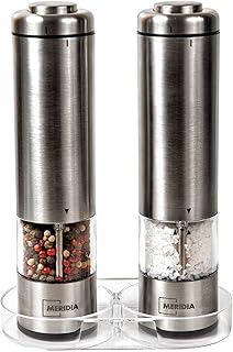 Meridia 電気塩コショウグラインダーセット – 電池式キッチンミル (電池付属) – ステンレススチールペッパーミル ライトと調節可能な粗さ付き