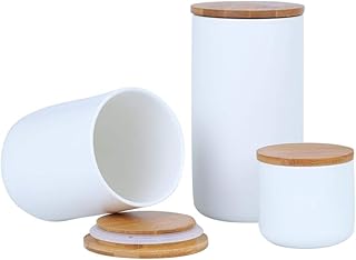 Newness 食品保存キャニスター 竹蓋付き (3個セット) 気密セラミックホワイトストレージジャー スパイス/コーヒー/砂糖などに 10.13液量オンス (300ml)